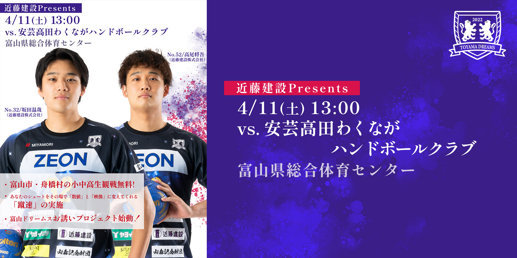 4/11(SAT) 13:00【近藤建設Presents】vs. 安芸高田わくながハンドボールクラブ…