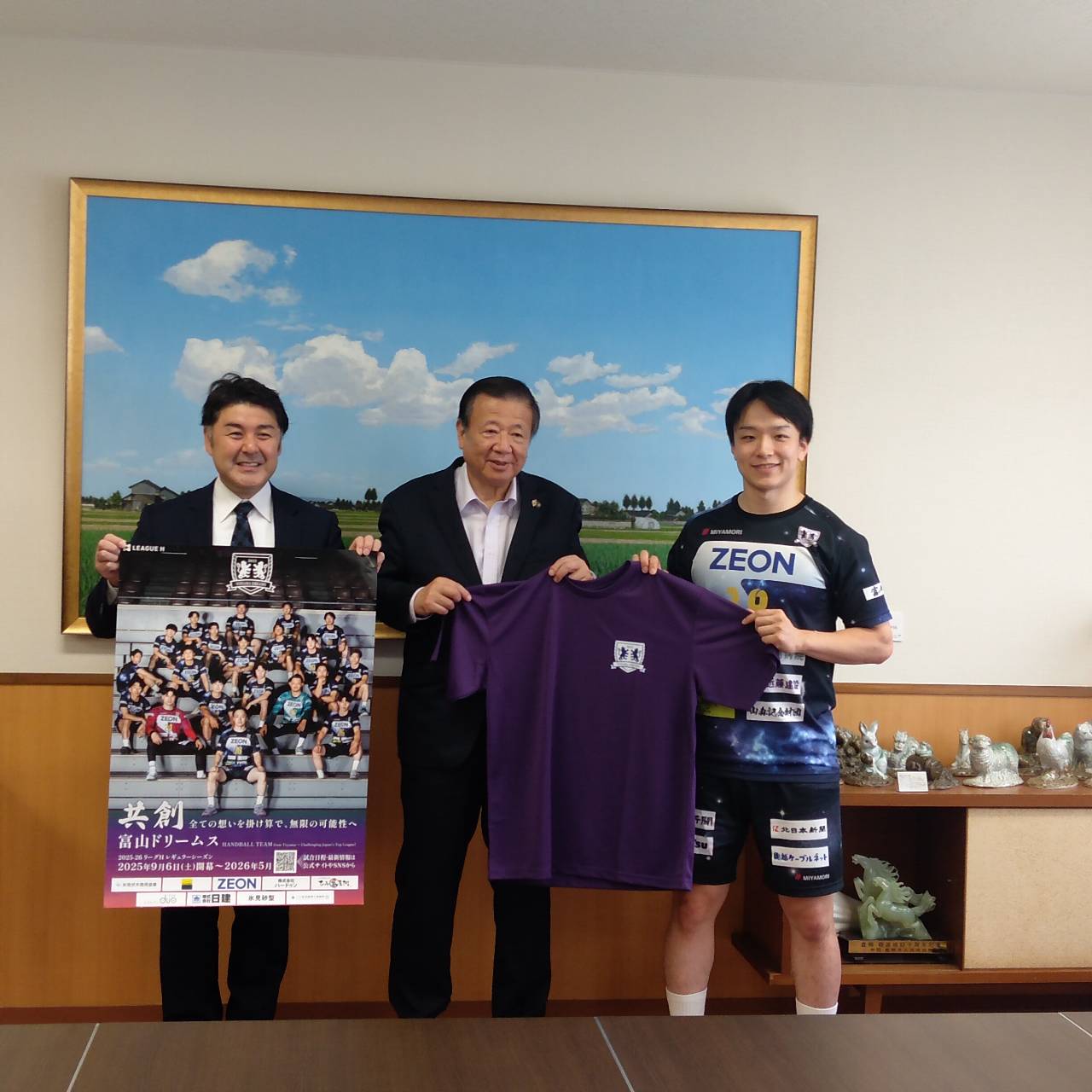 2025年10月8日、富山ドリームスの大房和雄監督、キャプテンのNo.18/青沼健太選手(株式会社 富山銀行)が砺波市役所を訪れ夏野 修市長を表敬訪問しました。