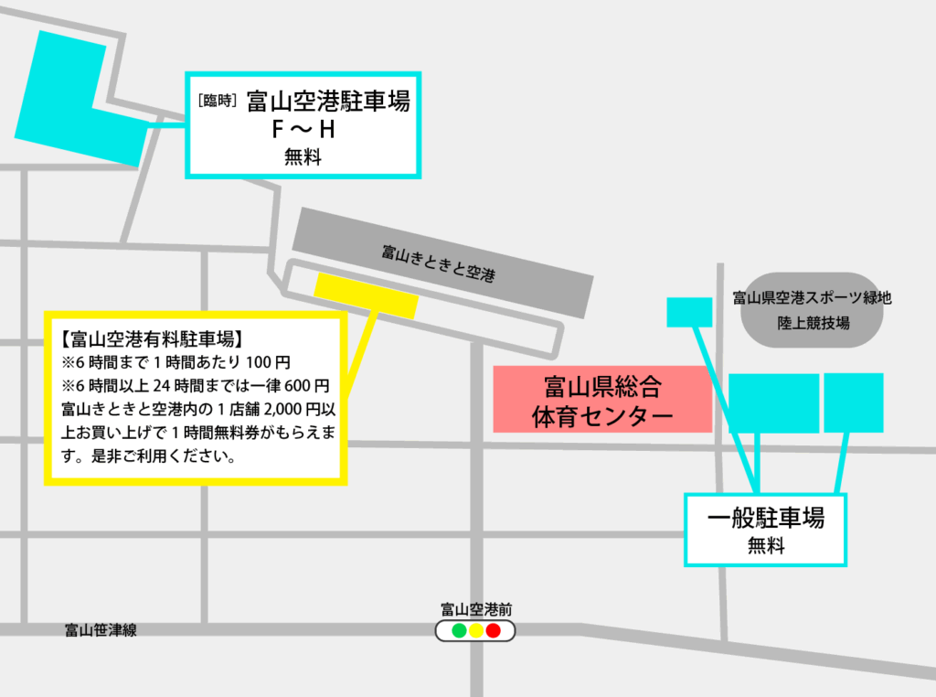 富山県空港スポーツ緑地 陸上競技場前の駐車場、富山県総合体育センター裏の駐車場の一部、富山空港の無料駐車場【F~H】をご利用ください。