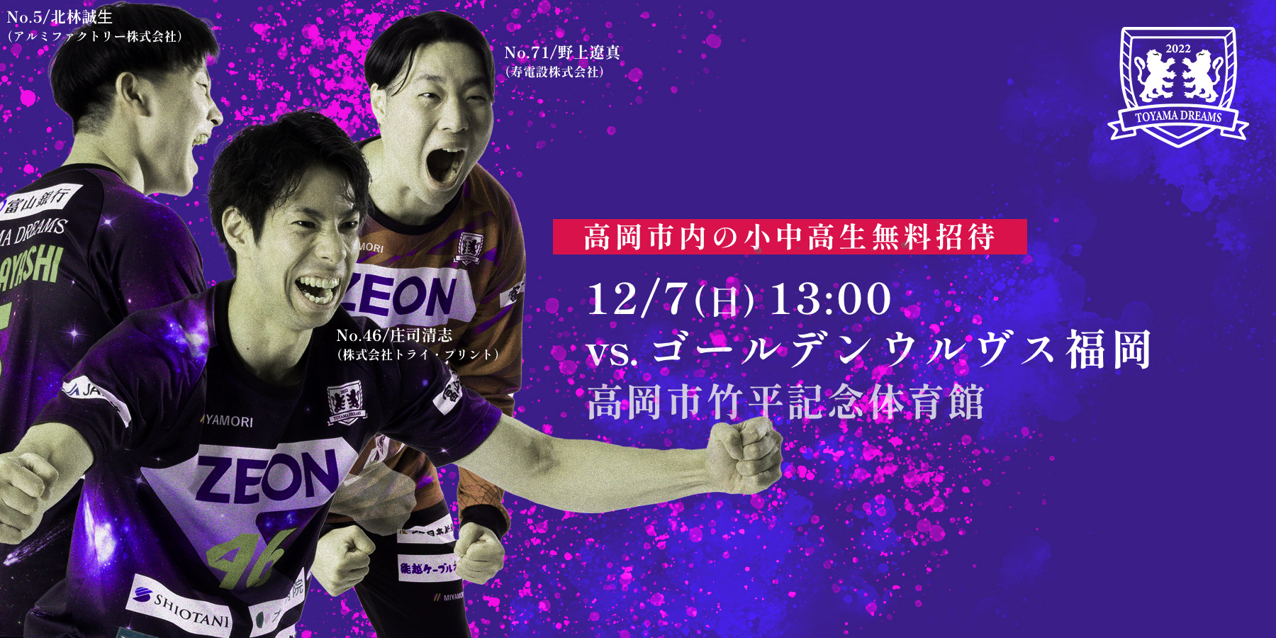 12/7(SUN) 13:00 vs. ゴールデンウルヴス福岡(高岡市竹平記念体育館)の会場情報